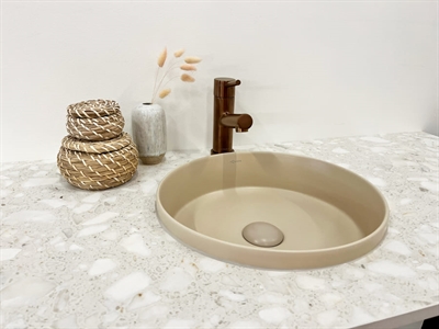 Rigtig flot rund porcelæns vask der både kan monteres direkte oven på bordpladen (Top-montering) eller fræset ned i bordpladen (Drop-down montering). Fås i flere flotte farver. Porcelæn er et keramisk produkt af kaolin, kvarts og feldspat. Formet, tørret og derefter brændt ved 900-1600 °C