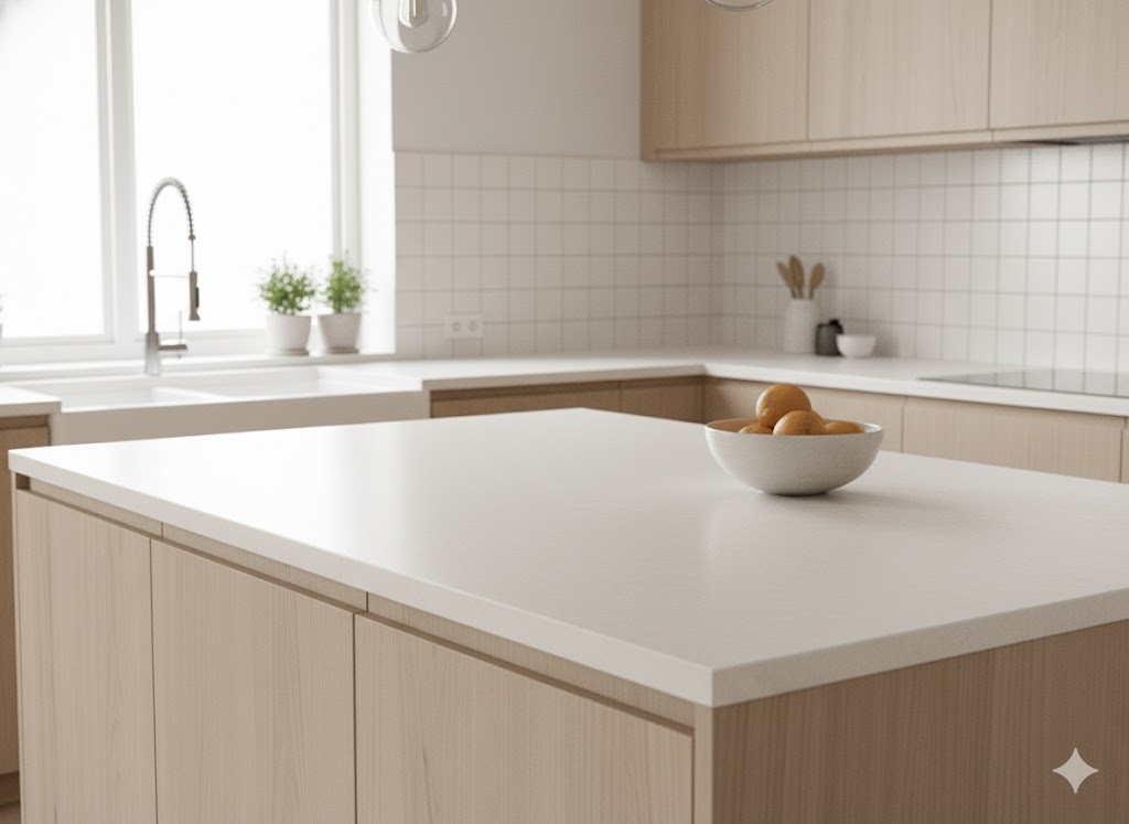 Cameo White Corian® bordpladen er en af de meget populære Corian bordplader. En Cameo White Corian bordplade er en lækker, cremet flødehvid bordplade med en varm og blød, let gylden undertone. Farven er skøn og komplementerer flot corian®materialets silkebløde finish. Corians hvide nuancer er generelt meget populære som køkkenbordplader, da hårdt slid næsten ikke ses på disse lyse, ensartede overflader. Men en Cameo White Corian bordplade er også super flot på badeværelser, hvor den f.eks. matcher træfarver utroligt smukt.