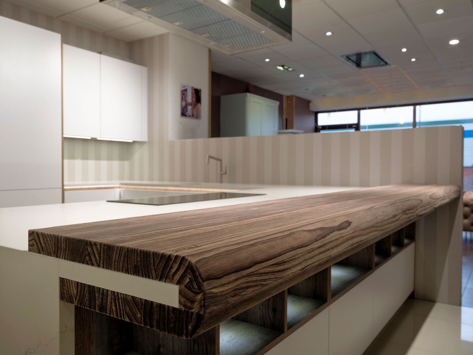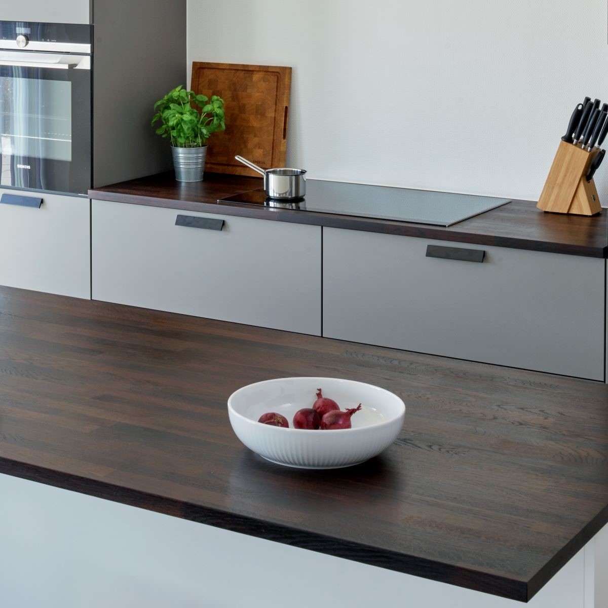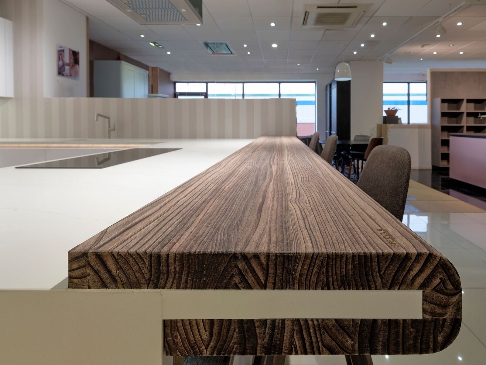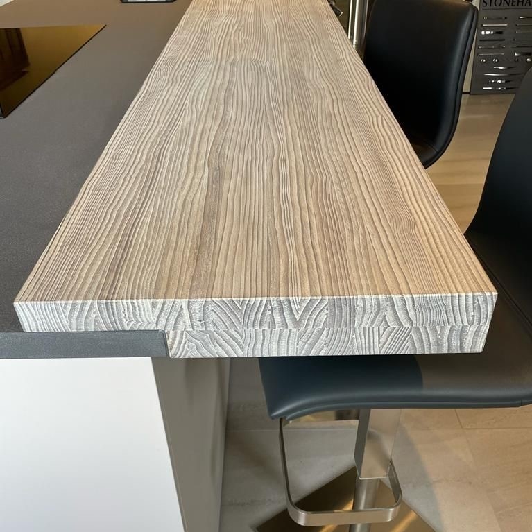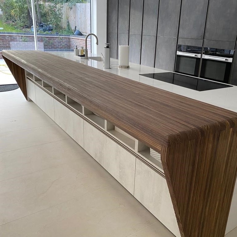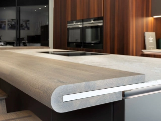 Bow WrapBow Wrap er en helt særlig SPEKVA løsning, hvor der bygges en træbordplade rundt om udhænget på f.eks. en køkkenø. Snedkerløsning Bow Wrap er ganske enkelt en fantastisk løsning. Udhænget på bordpladen bliver flot pakket ind i træ. Forkanten afrundes pænt og enkelt, og kontrasten til f.eks. en stenbordplade giver hele løsningen et kvalitetsmæssigt løft. Billedet viser en Bow Wrap i træsorten Brasilica 30 mm tyk neutral olie.