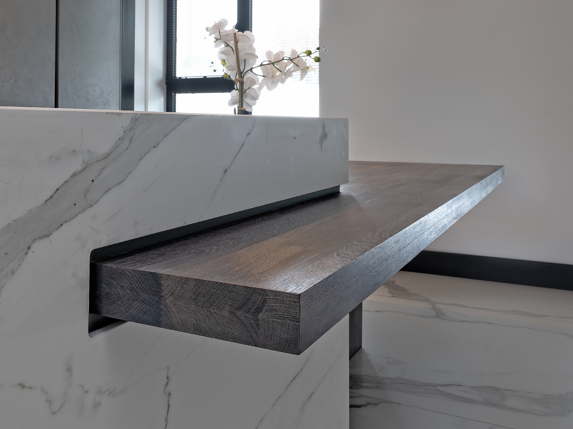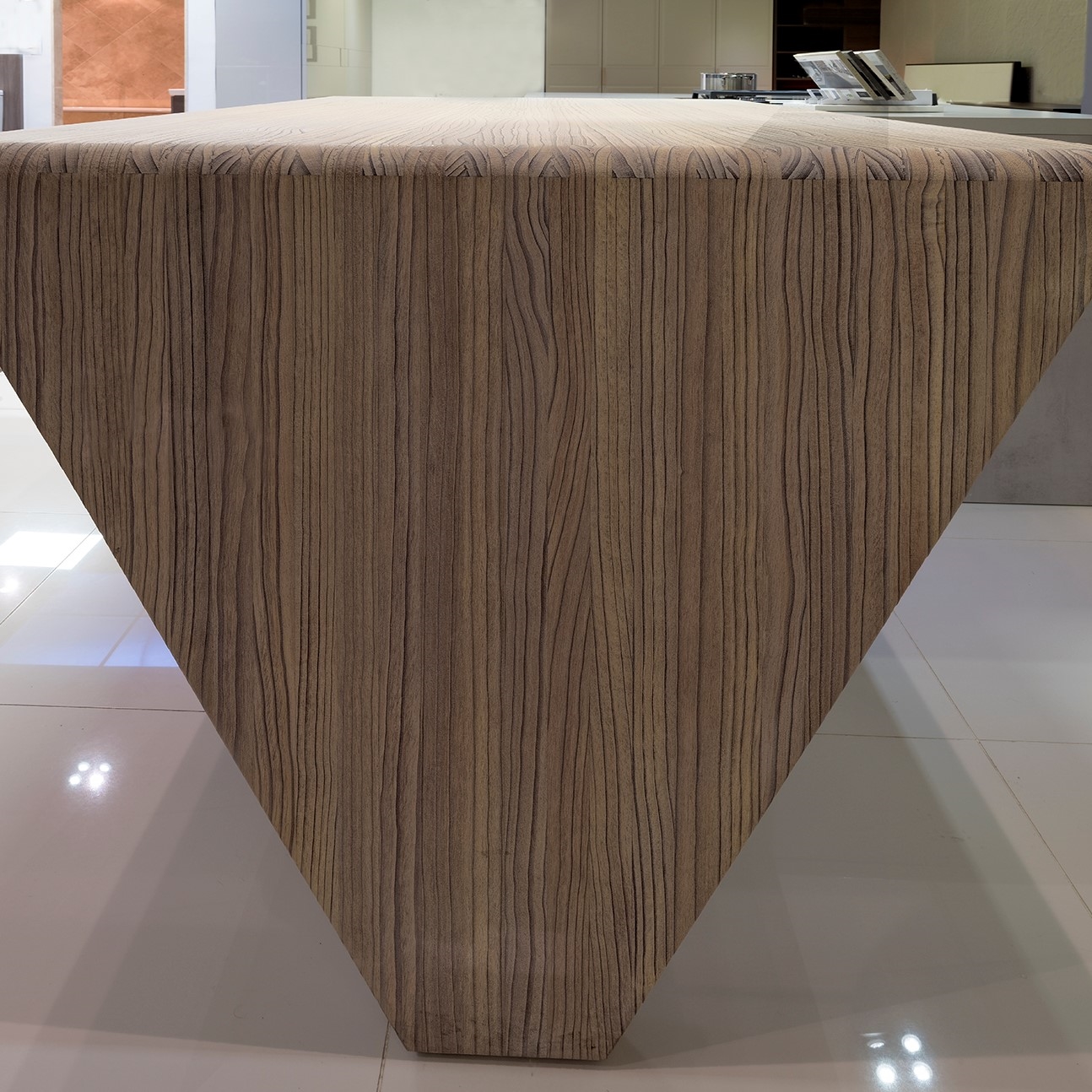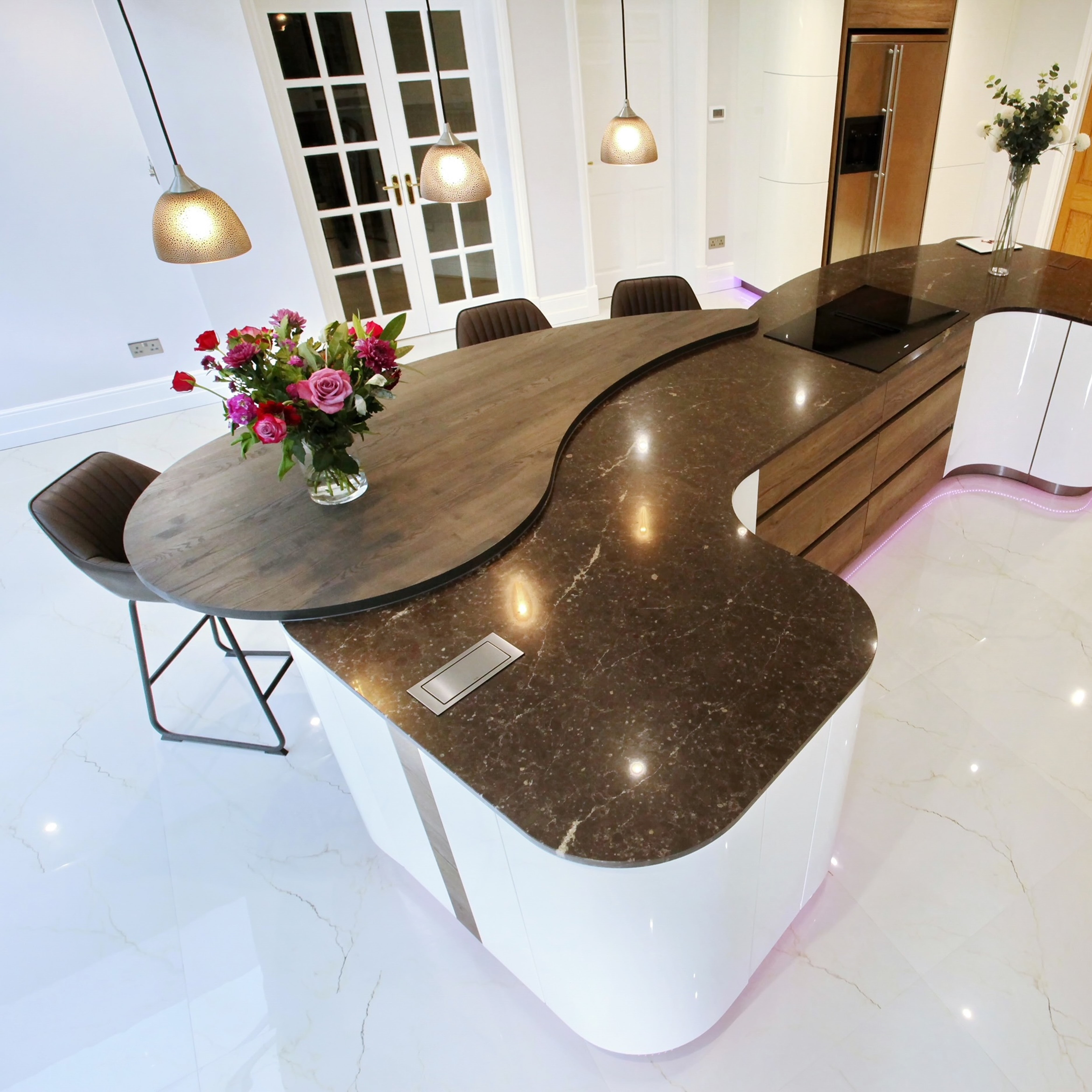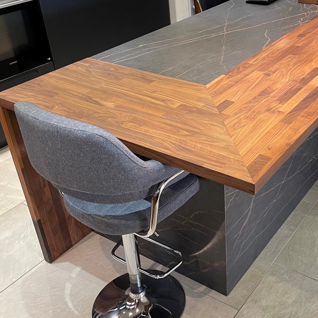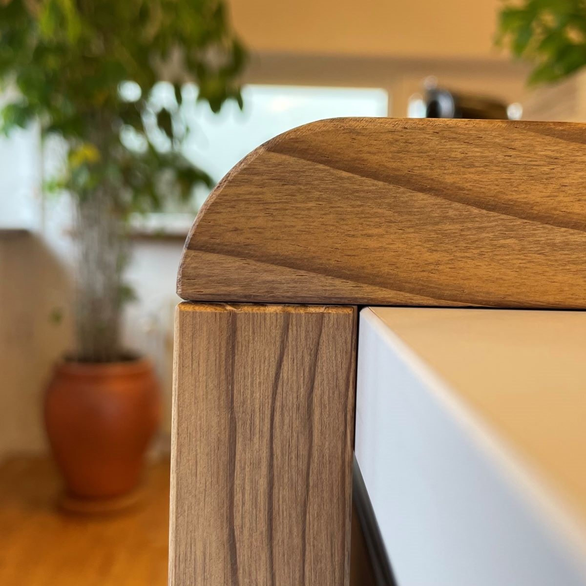 Bow WrapBow Wrap er en helt særlig SPEKVA løsning, hvor der bygges en træbordplade rundt om udhænget på f.eks. en køkkenø. Snedkerløsning Bow Wrap er ganske enkelt en fantastisk løsning. Udhænget på bordpladen bliver flot pakket ind i træ. Forkanten afrundes pænt og enkelt, og kontrasten til f.eks. en stenbordplade giver hele løsningen et kvalitetsmæssigt løft. Billedet viser en Bow Wrap i træsorten Brasilica 30 mm tyk neutral olie.