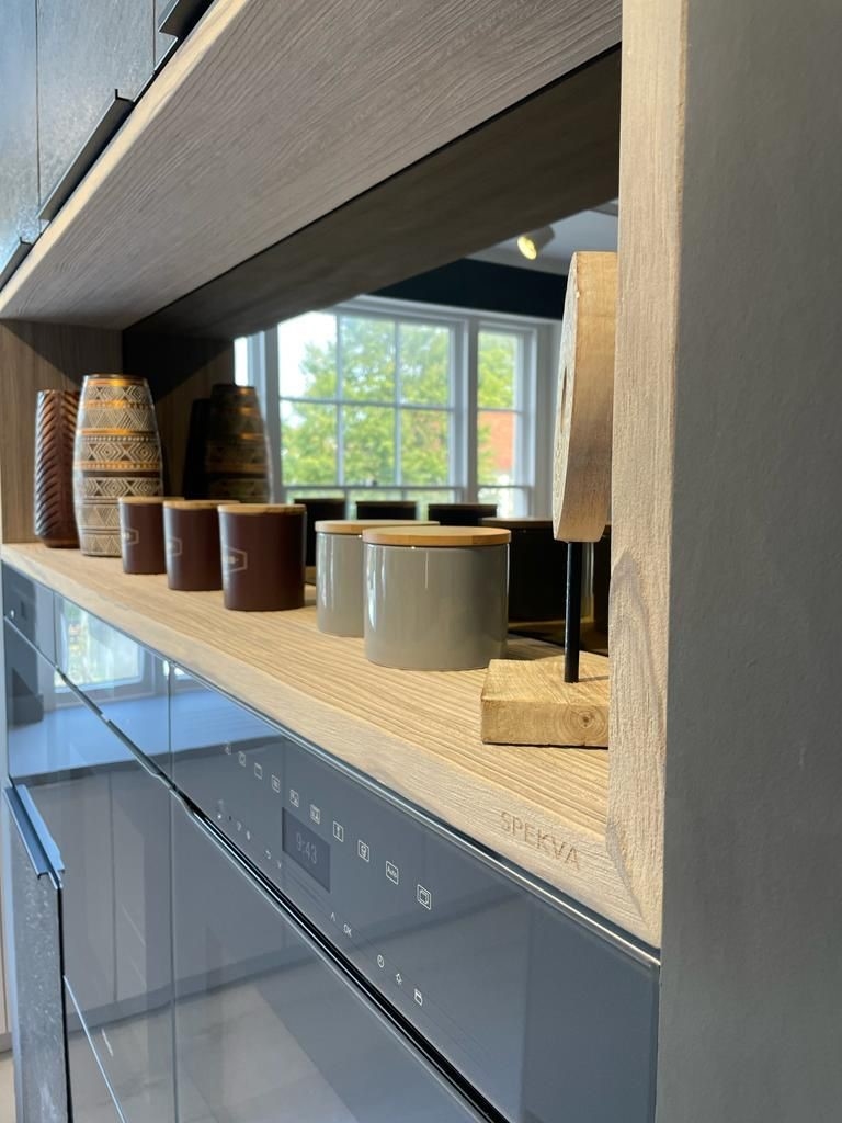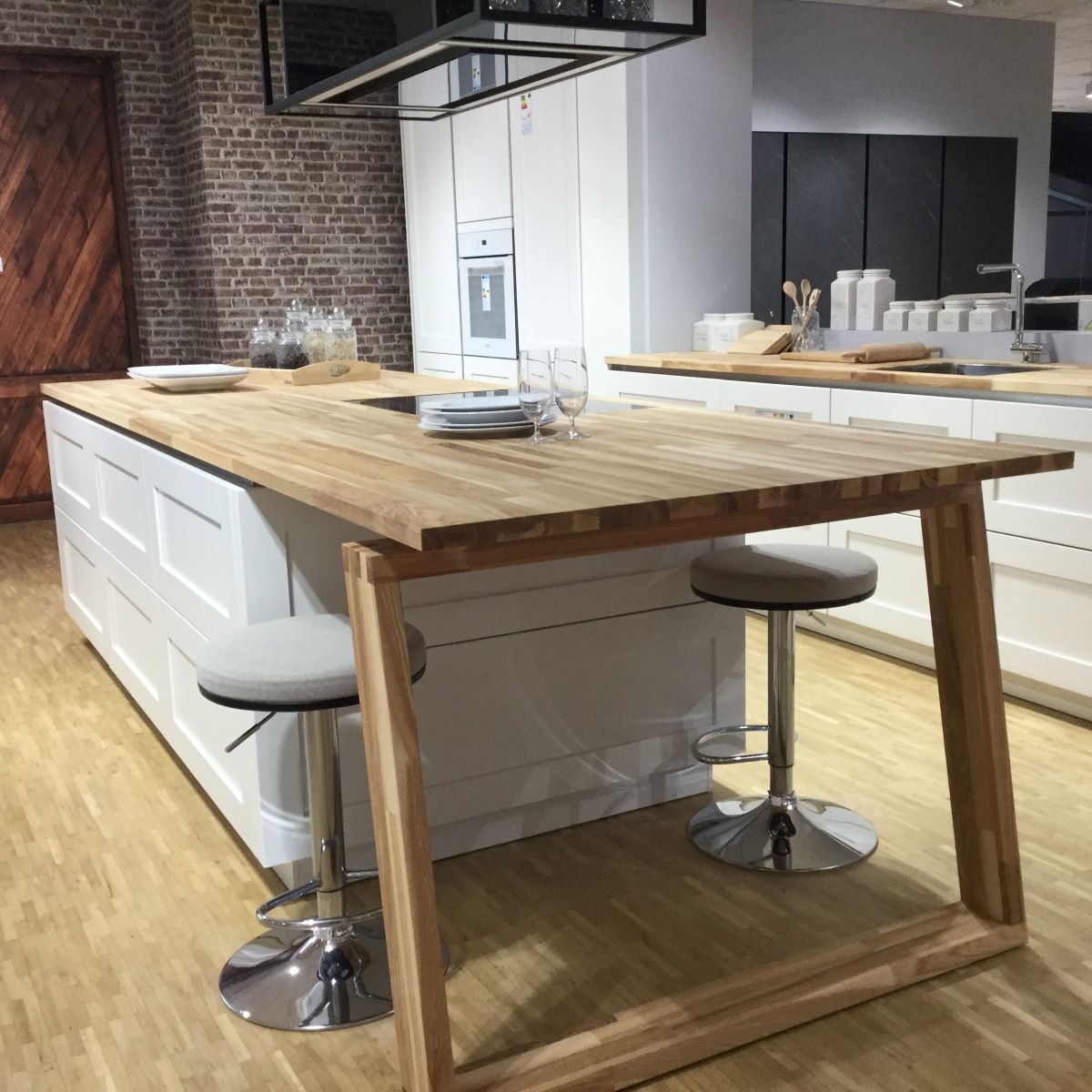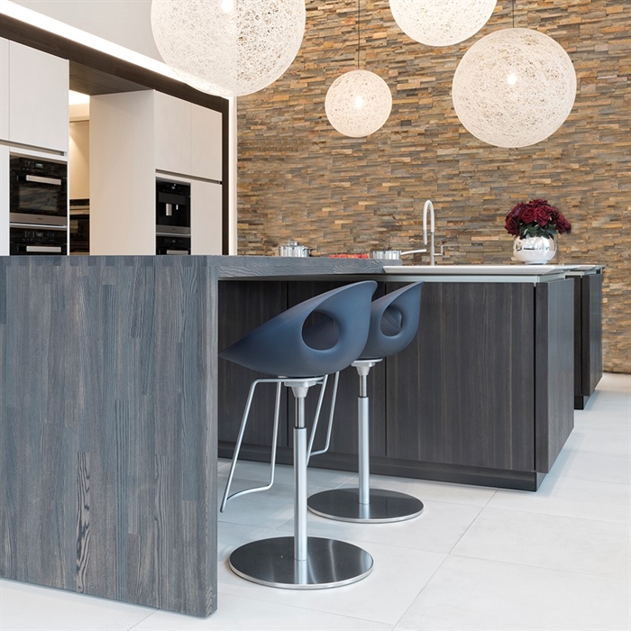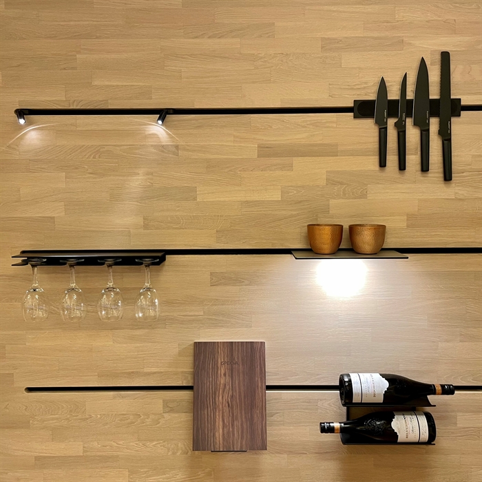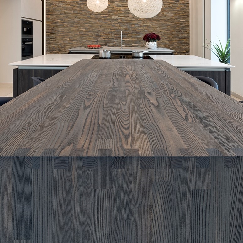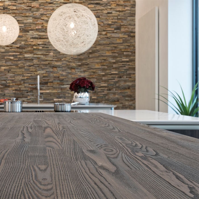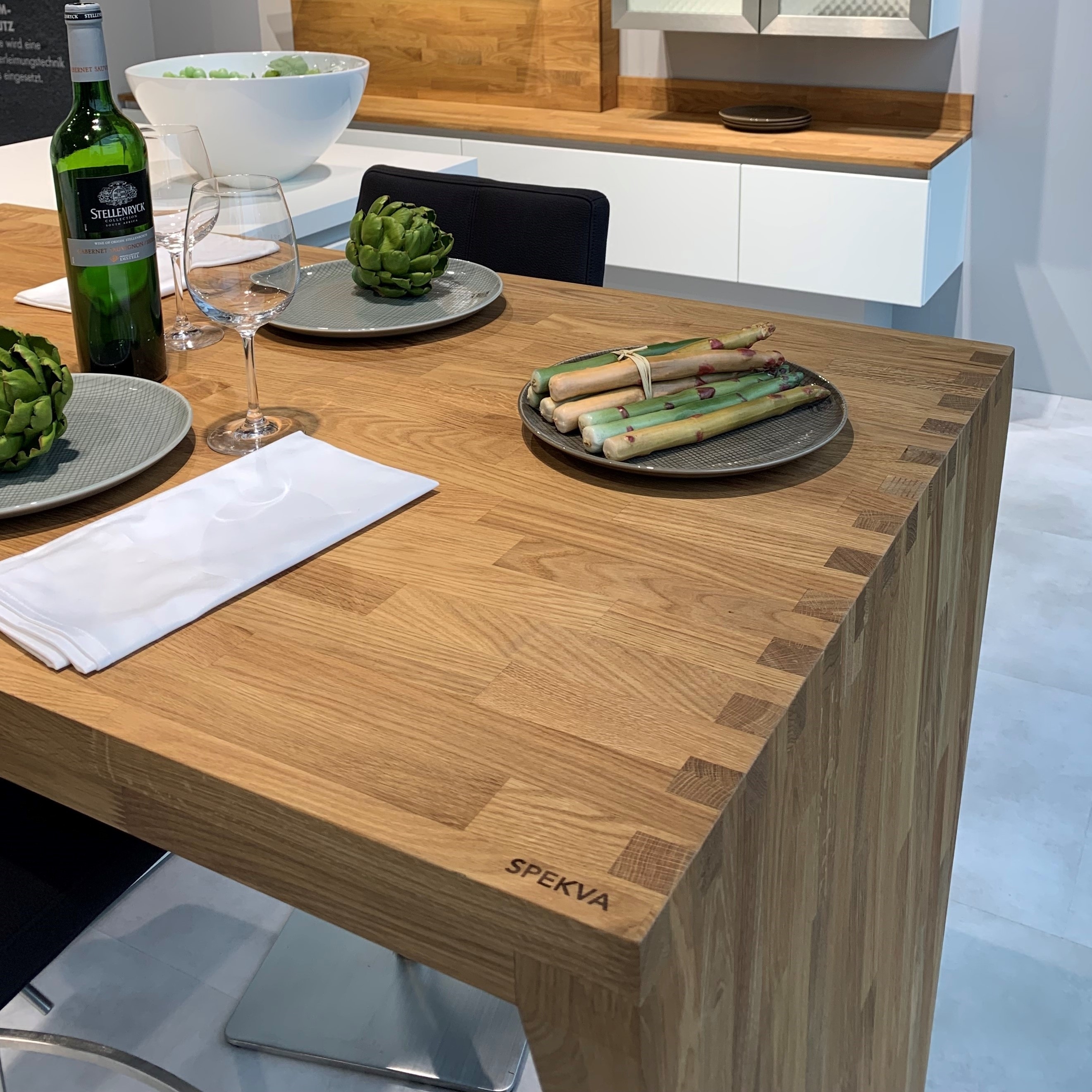 SpecialløsningerSe billeder af forskellige Spekva løsninger Integreret bar med gavlløsning 60 mm barbordplade flot integreret langs køkkenøen. Galvløsningen giver stabilitet til bordpladen, således der kan opnås et større udhæng Træudhæng til siddepladser 2 stk 30 mm massive træbordplader limes sammen, således man får et solidt udhæng på f.eks. en køkkenø. Forskydningen i træbordpladerne giver en flot effekt set fra enden., Bow Wrap indpakning af udhæng Flot snedkerløsning hvor udhænget på f.eks. en køkkenØ pakkes ind i en træbordplade. Bow Wrap laves, så løsningen passer til tykkelsen af bordpladen, den skal monteres på. Fås i alle træsorter og oliebehandlinger. Bagplade i træ med massive sider Bagpladen med massive sider og en top med integreret lys harmonerer flot med bordpladen i samme træsort. Træ giver en naturlig varme til rummet og indretningen. På billedet er vist eg med neutral olie. Kæmpe bar med skrå gavl sider Den meget lange barbordplade giver plads til spisende, men samtidig er der stadig adgang til opbevaring nedenunder. De skrå gavlender giver en lethed over den ellers tykke bordplade. Siddeplads til køkkenø med gavl Rigtig flot løsning med smigskåret 45 graders samling samt galvløsning der går til gulv. Den gyldne træbordplade giver en pæn kontrast til den hårde stenbordplade på køkkenøen. Denne løsning giver også et godt og solidt udhæng til siddende. Dråbeformet træbordplade Specialudskæringer er ikke noget problem. Denne dråbeformede træbordplade passer godt ind i køkkenets andre runde former. Der er mange muligheder indenfor specialudskæringer i træbordplader. Kun fantasien sætter grænser for, hvad der kan lade sig gøre. Alt træ håndsorteres I SPEKVA-værkstedet er der intet mindre end 9 stationer, hvor dygtige og erfarne medarbejdere med både hånd og øje sikrer, at bordpladen lever op til virksomhedens velkendte kvalitet. SPEKVA har 30 års garanti mod brud og unaturlige forandringer på alle bordplader i stavkonstruktionen Prima, Royal og Classic. Integreret ramme i massiv træ Her er bygget en ramme i massiv træ, som giver et flot stemningsfuldt element i køkkenet. Rammen er med dyvlede samlinger (kan også tappes sammen hvis ønsket), og lavet præcis på de mål kunden ønsker. Tappet gavlløsning Stor spiseplads med firkantet tappet samling, og en gavl der går helt til gulv. Træsorten er ask med vintage olie behandling, hvilket giver den mørke toning af træet. Askens åretegning ses tydeligt gennem olien. Integreret spiseplads i Wenge Special løsning hvor der er lavet en spiseplads i wenge, der indbygges i enden af køkkenøen. Bordpladen er en dobbeltplade i 60 mm tykkelse, og bordbenet er specialbygget til opgaven. Integreret spiseplads i køkkenø Den 60 mm tykke wenge bordplade er smart integreret i selve køkkenøen. Wenge er en mørk virkelig flot træsort med en tæt årestruktur. Tappet samling køkkenø i eg 60 mm tyk bordplade med firkantede tappede samlinger. Galvløsningen har skrå sider mod gulvet - lidt som et V. Det giver en ekstra finesse. Bordpladen er naturolieret egetræ i prima udgaven med spredte samlinger. Bow Tap gavlløsning i træsorten Brasilica V-skåret galvløsning i træsorten Brasilica. Samlingen er typen Bow Tap, som er tappet og derefter afrundet - det giver en rigtig flot vandfaldslignende effekt. Træsorten er naturolieret og Brasilica fås kun i Royal med gennemgående stave THEWALL® by SPEKVA er et stilrent og eksklusivt vægsystem, som er af høj kvalitet og samtidig utrolig fleksibelt, så du kan skabe et individuelt design. Stort udvalg af tilbehør Til bagvæggen findes der et bredt udvalg af tilbehør, som bl.a. belysning, hylder, opladere, krydderiglas, knivblok, opbevaring, vinholdere og meget mere. Vælger du at bestille en "THEWALL® by SPEKVA", så vil du efter købet modtage en kode og et link til THEWALL®s webshop, som byder på et bredt sortiment af tilbehør til din nye THEWALL®-bagvæg.