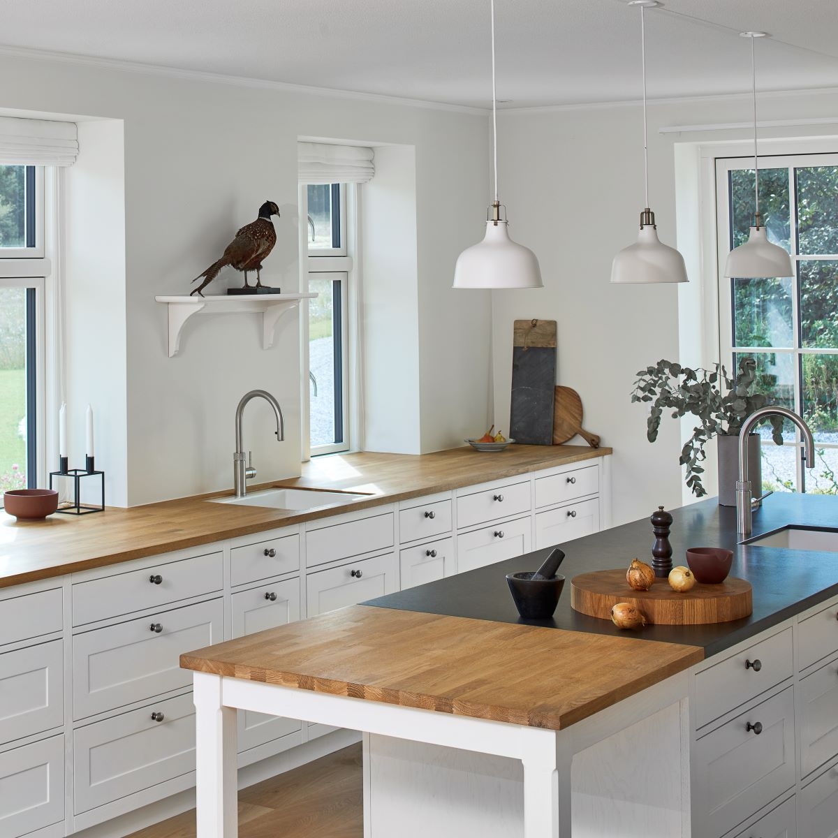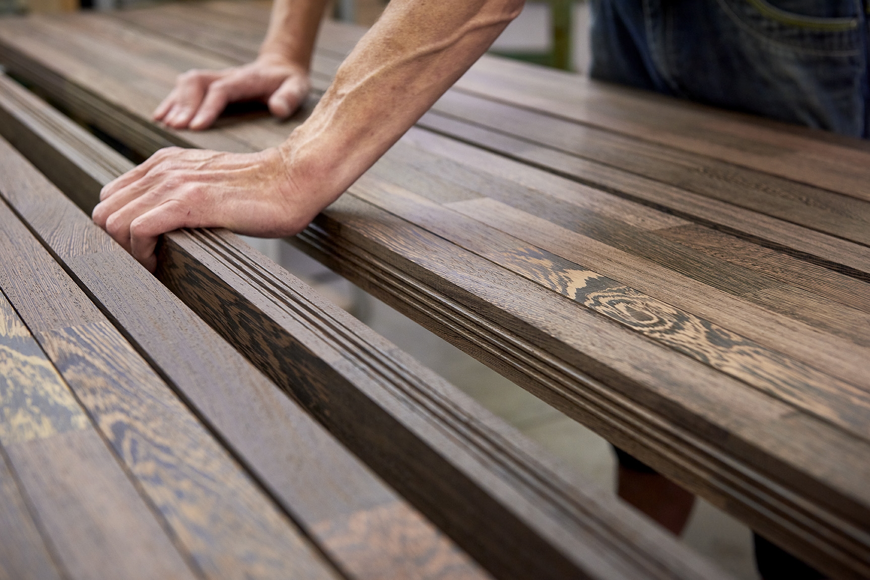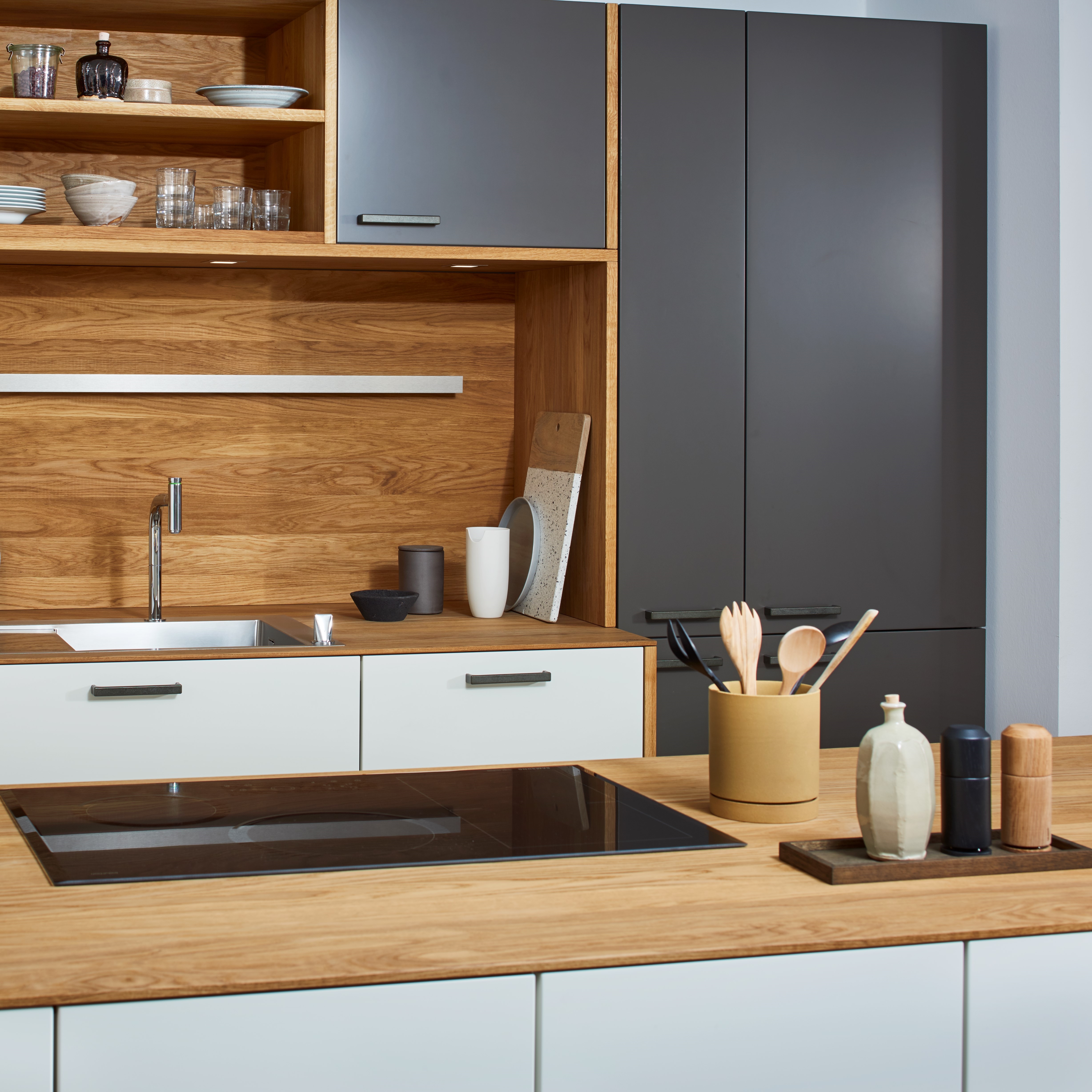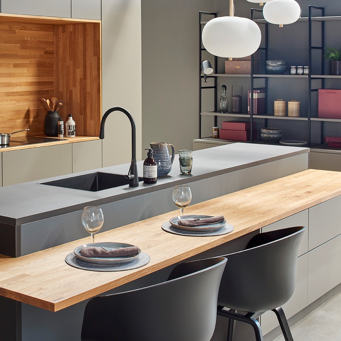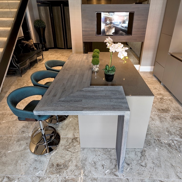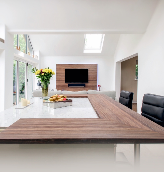 SpecialløsningerSe billeder af forskellige Spekva løsninger Integreret bar med gavlløsning 60 mm barbordplade flot integreret langs køkkenøen. Galvløsningen giver stabilitet til bordpladen, således der kan opnås et større udhæng Træudhæng til siddepladser 2 stk 30 mm massive træbordplader limes sammen, således man får et solidt udhæng på f.eks. en køkkenø. Forskydningen i træbordpladerne giver en flot effekt set fra enden., Bow Wrap indpakning af udhæng Flot snedkerløsning hvor udhænget på f.eks. en køkkenØ pakkes ind i en træbordplade. Bow Wrap laves, så løsningen passer til tykkelsen af bordpladen, den skal monteres på. Fås i alle træsorter og oliebehandlinger. Bagplade i træ med massive sider Bagpladen med massive sider og en top med integreret lys harmonerer flot med bordpladen i samme træsort. Træ giver en naturlig varme til rummet og indretningen. På billedet er vist eg med neutral olie. Kæmpe bar med skrå gavl sider Den meget lange barbordplade giver plads til spisende, men samtidig er der stadig adgang til opbevaring nedenunder. De skrå gavlender giver en lethed over den ellers tykke bordplade. Siddeplads til køkkenø med gavl Rigtig flot løsning med smigskåret 45 graders samling samt galvløsning der går til gulv. Den gyldne træbordplade giver en pæn kontrast til den hårde stenbordplade på køkkenøen. Denne løsning giver også et godt og solidt udhæng til siddende. Dråbeformet træbordplade Specialudskæringer er ikke noget problem. Denne dråbeformede træbordplade passer godt ind i køkkenets andre runde former. Der er mange muligheder indenfor specialudskæringer i træbordplader. Kun fantasien sætter grænser for, hvad der kan lade sig gøre. Alt træ håndsorteres I SPEKVA-værkstedet er der intet mindre end 9 stationer, hvor dygtige og erfarne medarbejdere med både hånd og øje sikrer, at bordpladen lever op til virksomhedens velkendte kvalitet. SPEKVA har 30 års garanti mod brud og unaturlige forandringer på alle bordplader i stavkonstruktionen Prima, Royal og Classic. Integreret ramme i massiv træ Her er bygget en ramme i massiv træ, som giver et flot stemningsfuldt element i køkkenet. Rammen er med dyvlede samlinger (kan også tappes sammen hvis ønsket), og lavet præcis på de mål kunden ønsker. Tappet gavlløsning Stor spiseplads med firkantet tappet samling, og en gavl der går helt til gulv. Træsorten er ask med vintage olie behandling, hvilket giver den mørke toning af træet. Askens åretegning ses tydeligt gennem olien. Integreret spiseplads i Wenge Special løsning hvor der er lavet en spiseplads i wenge, der indbygges i enden af køkkenøen. Bordpladen er en dobbeltplade i 60 mm tykkelse, og bordbenet er specialbygget til opgaven. Integreret spiseplads i køkkenø Den 60 mm tykke wenge bordplade er smart integreret i selve køkkenøen. Wenge er en mørk virkelig flot træsort med en tæt årestruktur. Tappet samling køkkenø i eg 60 mm tyk bordplade med firkantede tappede samlinger. Galvløsningen har skrå sider mod gulvet - lidt som et V. Det giver en ekstra finesse. Bordpladen er naturolieret egetræ i prima udgaven med spredte samlinger. Bow Tap gavlløsning i træsorten Brasilica V-skåret galvløsning i træsorten Brasilica. Samlingen er typen Bow Tap, som er tappet og derefter afrundet - det giver en rigtig flot vandfaldslignende effekt. Træsorten er naturolieret og Brasilica fås kun i Royal med gennemgående stave THEWALL® by SPEKVA er et stilrent og eksklusivt vægsystem, som er af høj kvalitet og samtidig utrolig fleksibelt, så du kan skabe et individuelt design. Stort udvalg af tilbehør Til bagvæggen findes der et bredt udvalg af tilbehør, som bl.a. belysning, hylder, opladere, krydderiglas, knivblok, opbevaring, vinholdere og meget mere. Vælger du at bestille en "THEWALL® by SPEKVA", så vil du efter købet modtage en kode og et link til THEWALL®s webshop, som byder på et bredt sortiment af tilbehør til din nye THEWALL®-bagvæg.