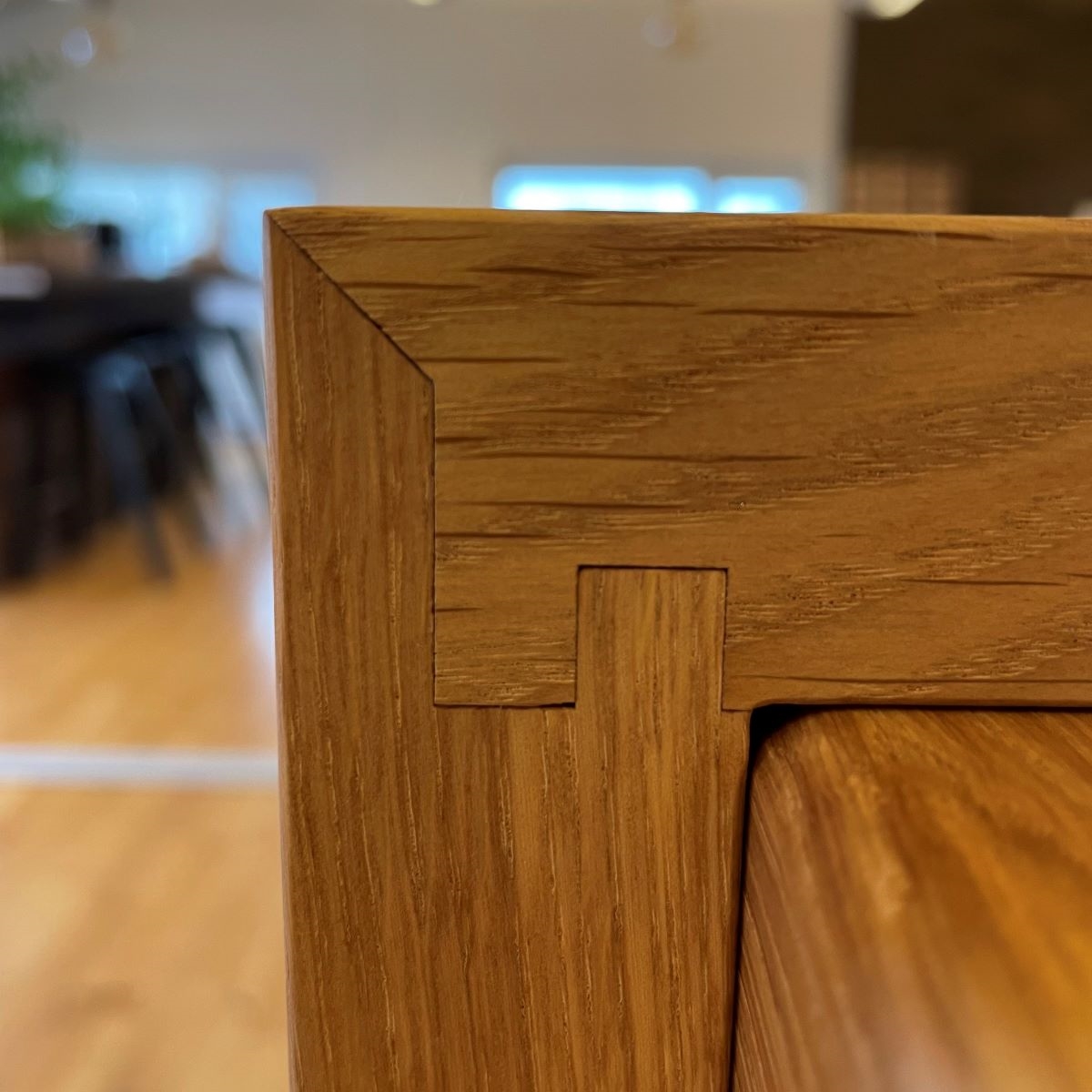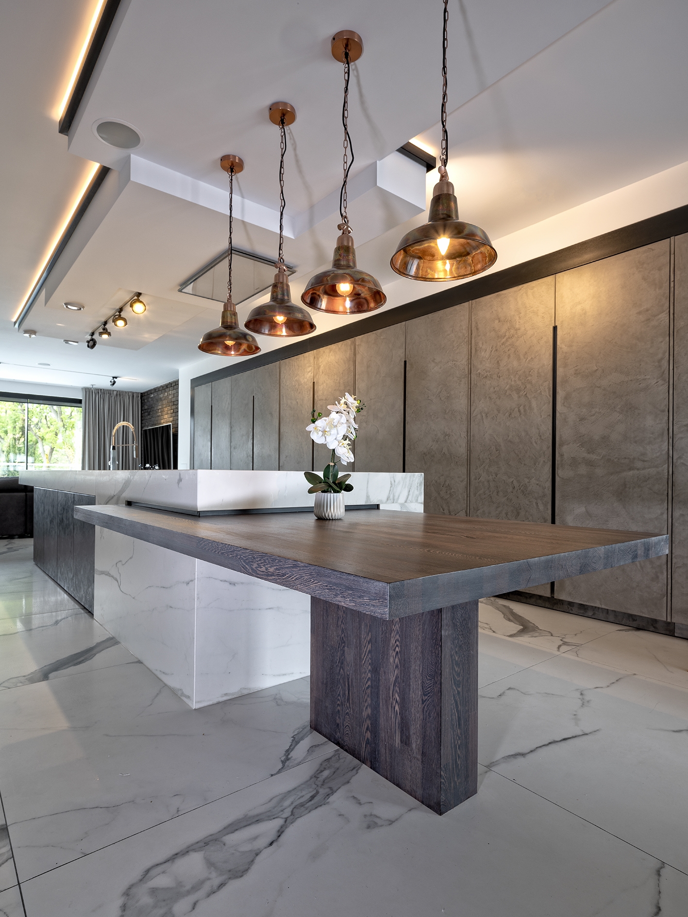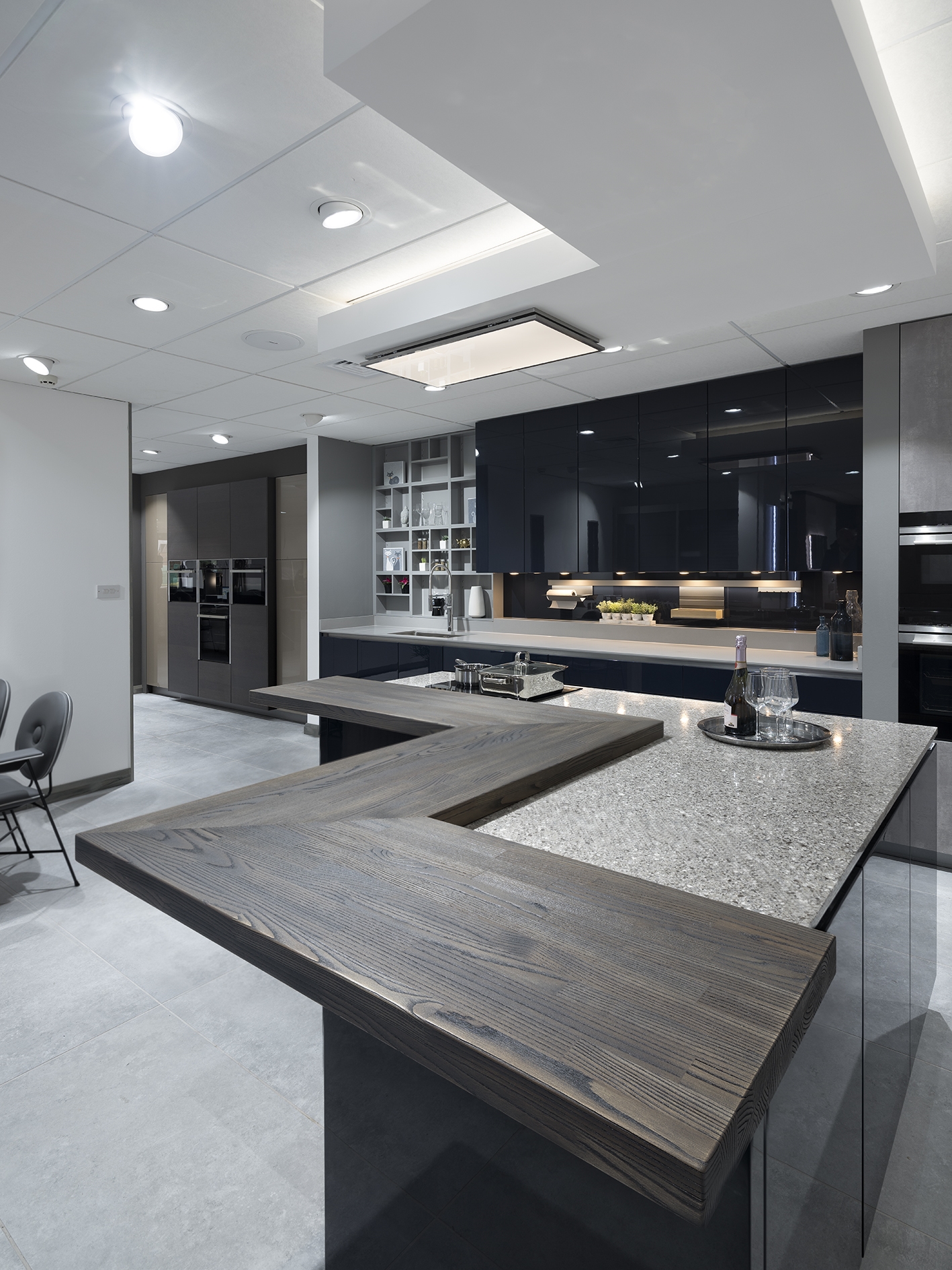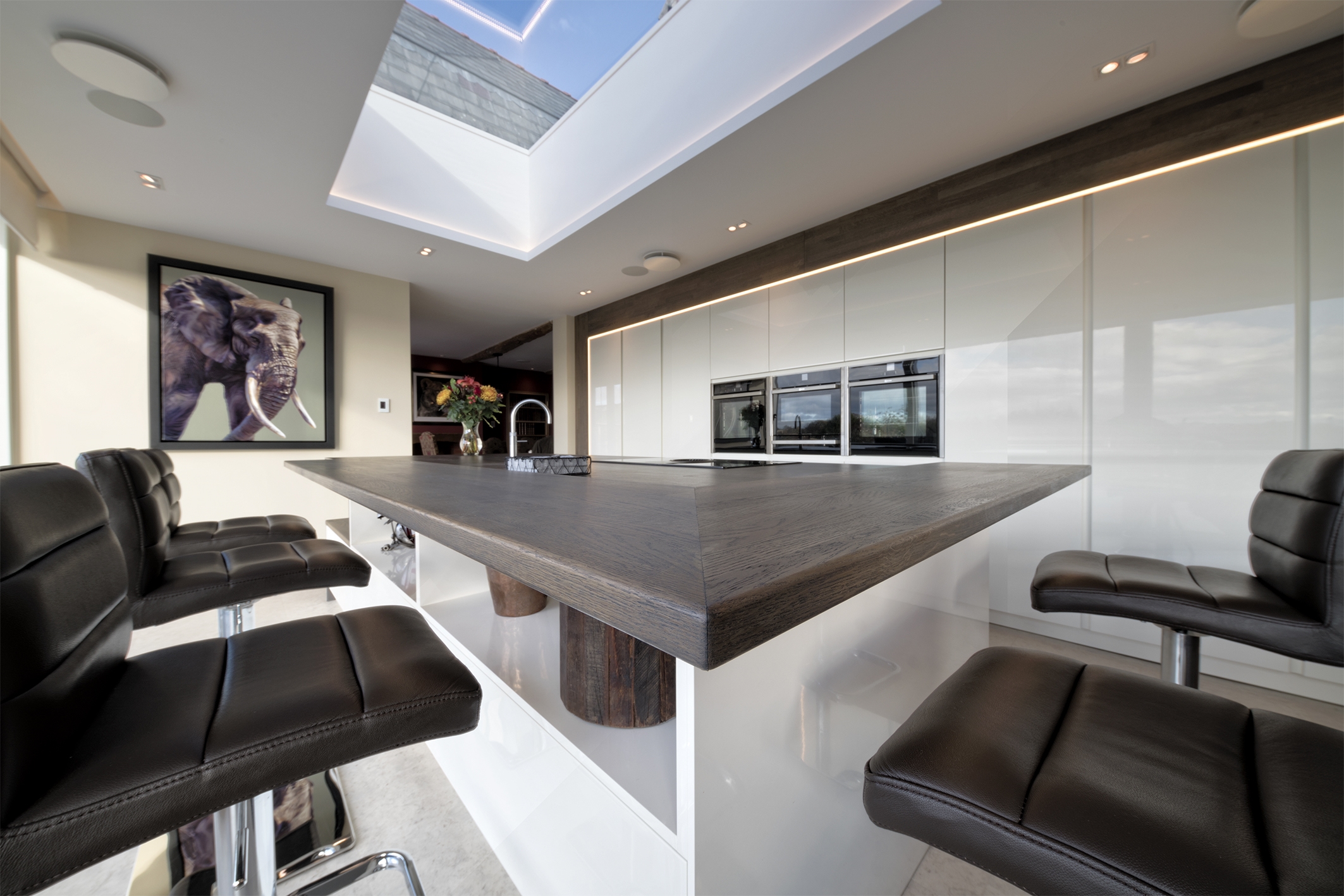 SpecialløsningerSe billeder af forskellige Spekva løsninger Integreret bar med gavlløsning 60 mm barbordplade flot integreret langs køkkenøen. Galvløsningen giver stabilitet til bordpladen, således der kan opnås et større udhæng Træudhæng til siddepladser 2 stk 30 mm massive træbordplader limes sammen, således man får et solidt udhæng på f.eks. en køkkenø. Forskydningen i træbordpladerne giver en flot effekt set fra enden., Bow Wrap indpakning af udhæng Flot snedkerløsning hvor udhænget på f.eks. en køkkenØ pakkes ind i en træbordplade. Bow Wrap laves, så løsningen passer til tykkelsen af bordpladen, den skal monteres på. Fås i alle træsorter og oliebehandlinger. Bagplade i træ med massive sider Bagpladen med massive sider og en top med integreret lys harmonerer flot med bordpladen i samme træsort. Træ giver en naturlig varme til rummet og indretningen. På billedet er vist eg med neutral olie. Kæmpe bar med skrå gavl sider Den meget lange barbordplade giver plads til spisende, men samtidig er der stadig adgang til opbevaring nedenunder. De skrå gavlender giver en lethed over den ellers tykke bordplade. Siddeplads til køkkenø med gavl Rigtig flot løsning med smigskåret 45 graders samling samt galvløsning der går til gulv. Den gyldne træbordplade giver en pæn kontrast til den hårde stenbordplade på køkkenøen. Denne løsning giver også et godt og solidt udhæng til siddende. Dråbeformet træbordplade Specialudskæringer er ikke noget problem. Denne dråbeformede træbordplade passer godt ind i køkkenets andre runde former. Der er mange muligheder indenfor specialudskæringer i træbordplader. Kun fantasien sætter grænser for, hvad der kan lade sig gøre. Alt træ håndsorteres I SPEKVA-værkstedet er der intet mindre end 9 stationer, hvor dygtige og erfarne medarbejdere med både hånd og øje sikrer, at bordpladen lever op til virksomhedens velkendte kvalitet. SPEKVA har 30 års garanti mod brud og unaturlige forandringer på alle bordplader i stavkonstruktionen Prima, Royal og Classic. Integreret ramme i massiv træ Her er bygget en ramme i massiv træ, som giver et flot stemningsfuldt element i køkkenet. Rammen er med dyvlede samlinger (kan også tappes sammen hvis ønsket), og lavet præcis på de mål kunden ønsker. Tappet gavlløsning Stor spiseplads med firkantet tappet samling, og en gavl der går helt til gulv. Træsorten er ask med vintage olie behandling, hvilket giver den mørke toning af træet. Askens åretegning ses tydeligt gennem olien. Integreret spiseplads i Wenge Special løsning hvor der er lavet en spiseplads i wenge, der indbygges i enden af køkkenøen. Bordpladen er en dobbeltplade i 60 mm tykkelse, og bordbenet er specialbygget til opgaven. Integreret spiseplads i køkkenø Den 60 mm tykke wenge bordplade er smart integreret i selve køkkenøen. Wenge er en mørk virkelig flot træsort med en tæt årestruktur. Tappet samling køkkenø i eg 60 mm tyk bordplade med firkantede tappede samlinger. Galvløsningen har skrå sider mod gulvet - lidt som et V. Det giver en ekstra finesse. Bordpladen er naturolieret egetræ i prima udgaven med spredte samlinger. Bow Tap gavlløsning i træsorten Brasilica V-skåret galvløsning i træsorten Brasilica. Samlingen er typen Bow Tap, som er tappet og derefter afrundet - det giver en rigtig flot vandfaldslignende effekt. Træsorten er naturolieret og Brasilica fås kun i Royal med gennemgående stave THEWALL® by SPEKVA er et stilrent og eksklusivt vægsystem, som er af høj kvalitet og samtidig utrolig fleksibelt, så du kan skabe et individuelt design. Stort udvalg af tilbehør Til bagvæggen findes der et bredt udvalg af tilbehør, som bl.a. belysning, hylder, opladere, krydderiglas, knivblok, opbevaring, vinholdere og meget mere. Vælger du at bestille en "THEWALL® by SPEKVA", så vil du efter købet modtage en kode og et link til THEWALL®s webshop, som byder på et bredt sortiment af tilbehør til din nye THEWALL®-bagvæg.
