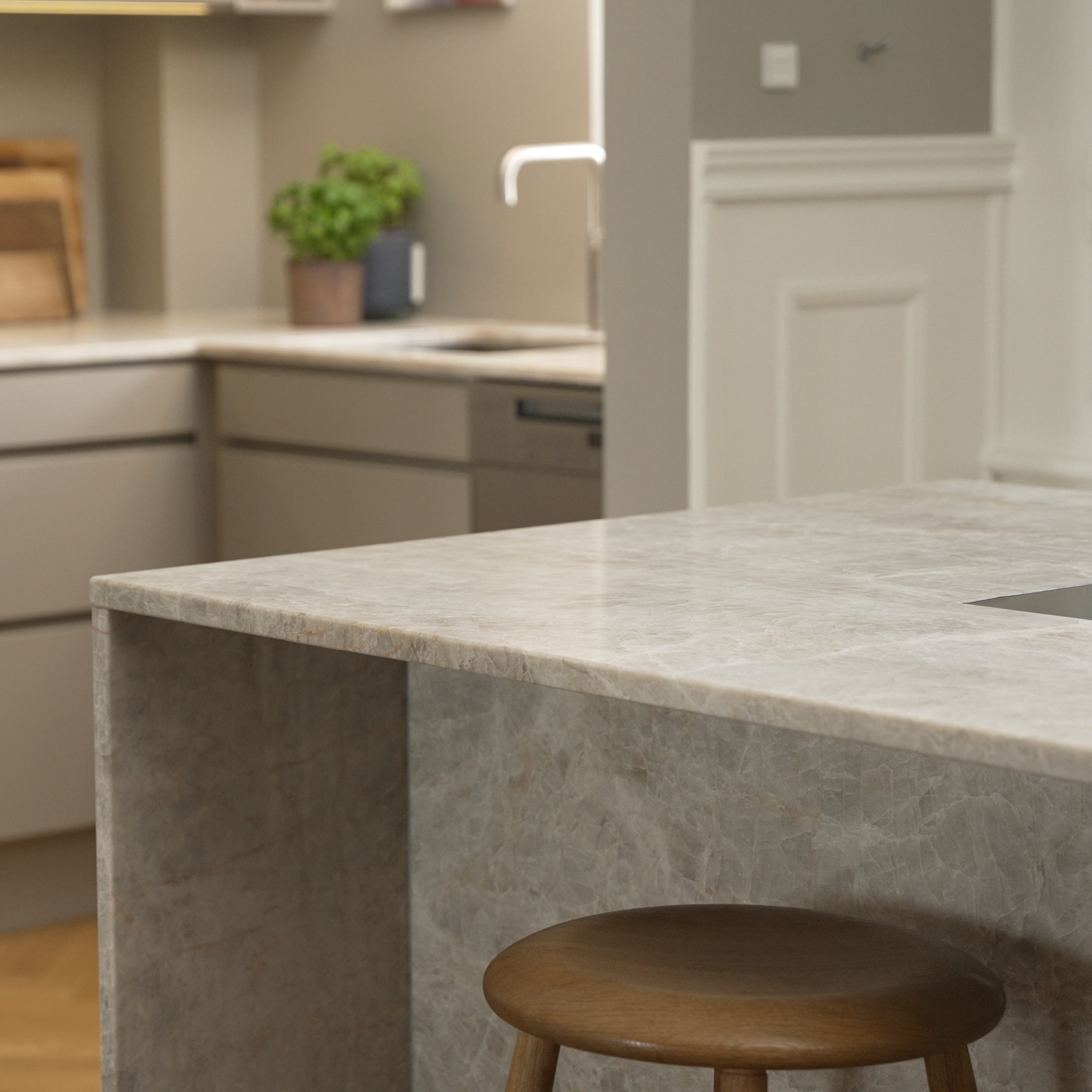 Her finder du granit, marmor, komposit, Dekton og quartzite i forskellige designs og løsninger.