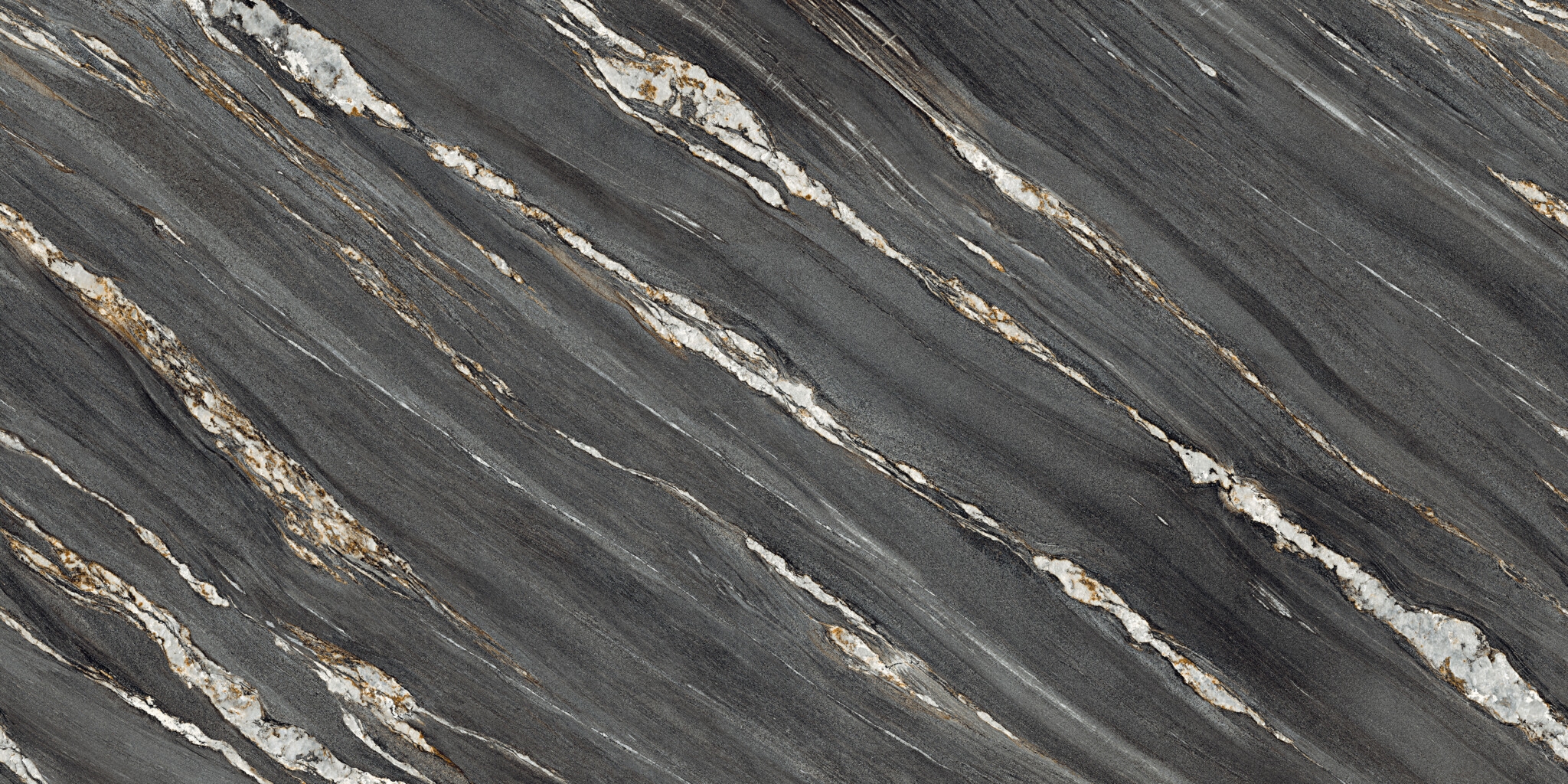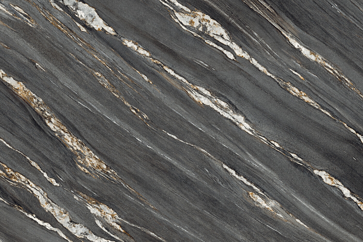 Farven Kuroca 4D har en dyb mørkegrå til sort grundtone med markante årer i gyldne og hvide nuancer, der skaber et naturtro og marmorinspireret udtryk. Den kontrastfyldte struktur giver bordpladen et iøjnefaldende udtryk, som tilfører både dybde og karakter til hjemmet.