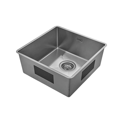 Funktionel og moderne kvadratisk stålvask med afrundede hjørner for nem rengøring samt kuvertbund, der effektivt leder vandet til afløbet.