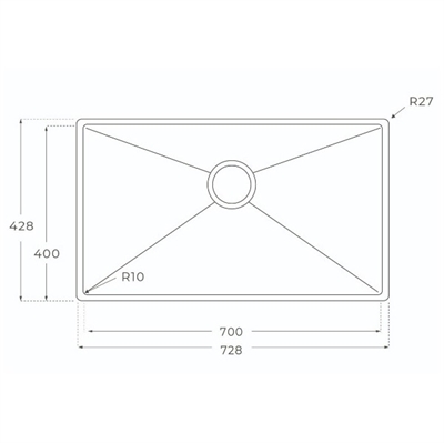 Stor men elegant stålvask med praktisk afrundede hjørner for nem rengøring samt kuvertbund, der effektivt leder vandet til afløbet.