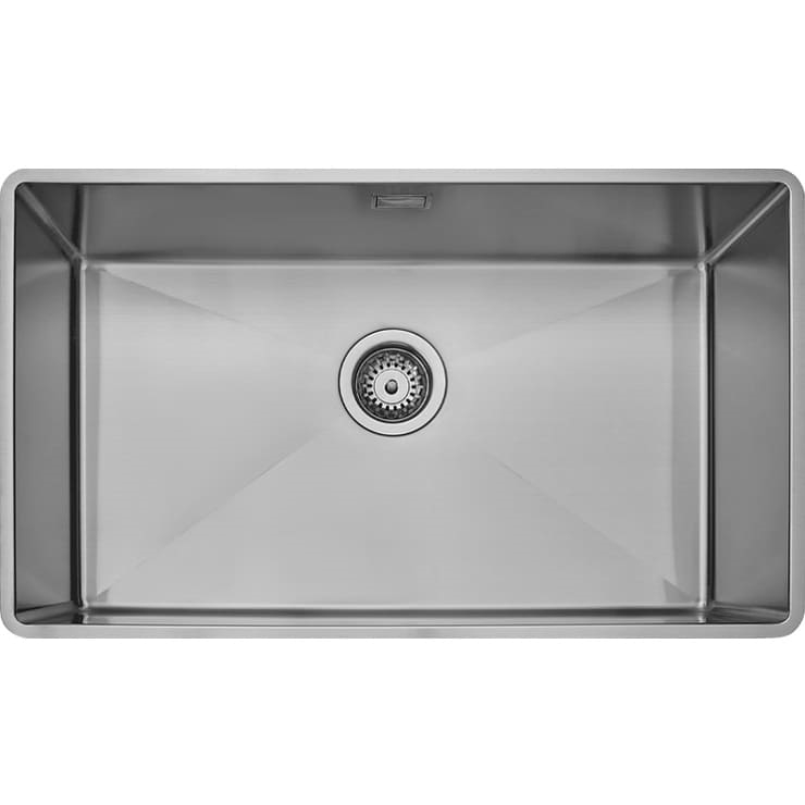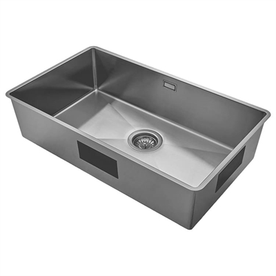 Stor men elegant stålvask med praktisk afrundede hjørner for nem rengøring samt kuvertbund, der effektivt leder vandet til afløbet.
